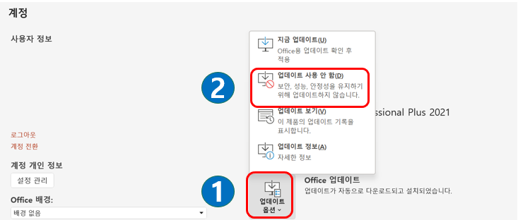 오피스를 사용중에 자동업데이트로 인한 불편함이 생길 수 있습니다.