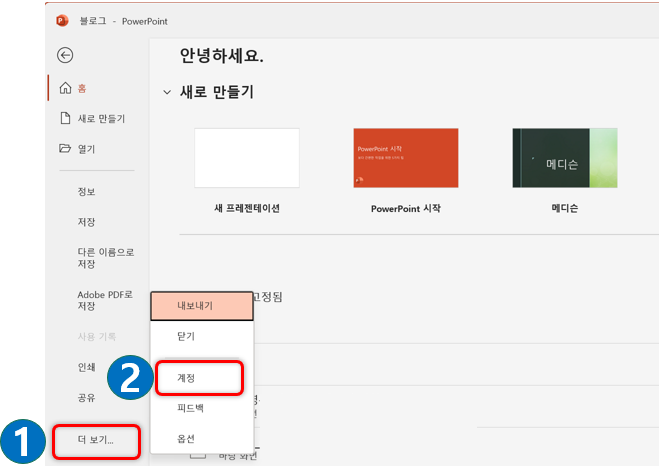 파일 메뉴에서 - 더보기 - 계정 메뉴로 진입합니다.