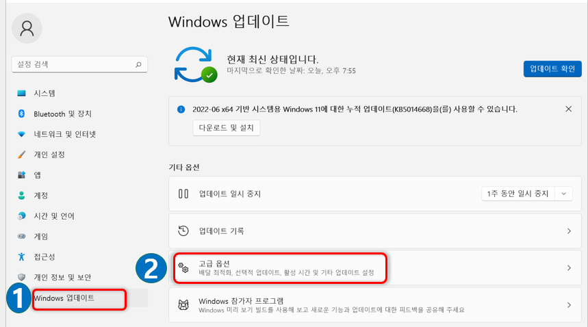 이후 Windows 업데이트 - 고급옵션 메뉴로 들어갑니다.