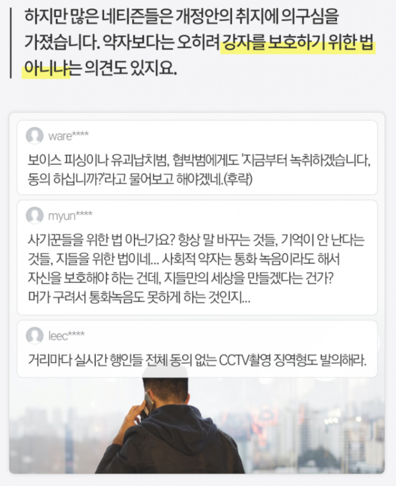 반대하는 측은 과도한 규제가 자칫 법적 근거 확보나 사회 고발이란 녹음의 순기능을 저해할 수 있어 신중해야 하고