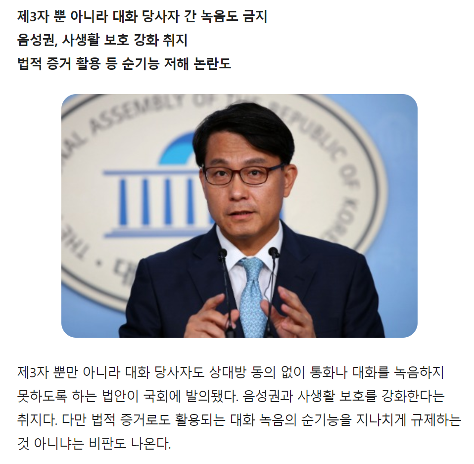 이 개정안은 제3자 뿐 아니라 대화 당사자도 상대 동의 없이 대화를 녹음하지 못하도록 한 게 주된 내용이다.