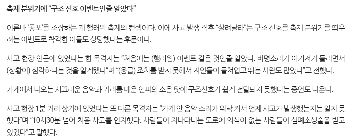 이태원에서 핼러원을 맞아 많은 인파가 모여, 이로 인한 압사 인명사고가 발생했습니다.