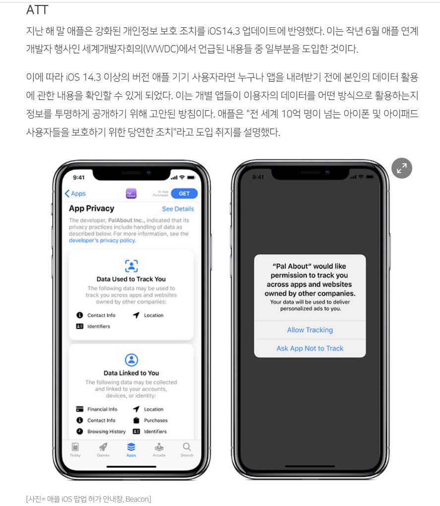 기사에 따르면 ATT는 개인정보 처리 방식이 '옵트 아웃(opt out)'에서 '옵트 인(opt in)'으로 변경된 것을 의미하는데요.