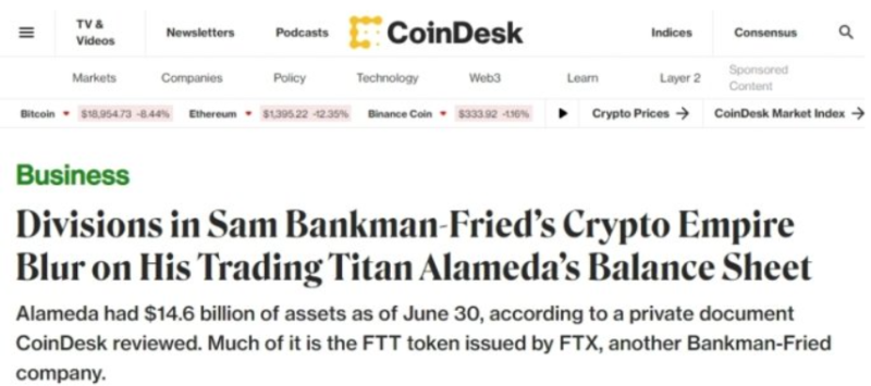 결국 이런 취약한 알라메다 리서치의 구조에 대해서 코인데스크의 기사가 뜨고