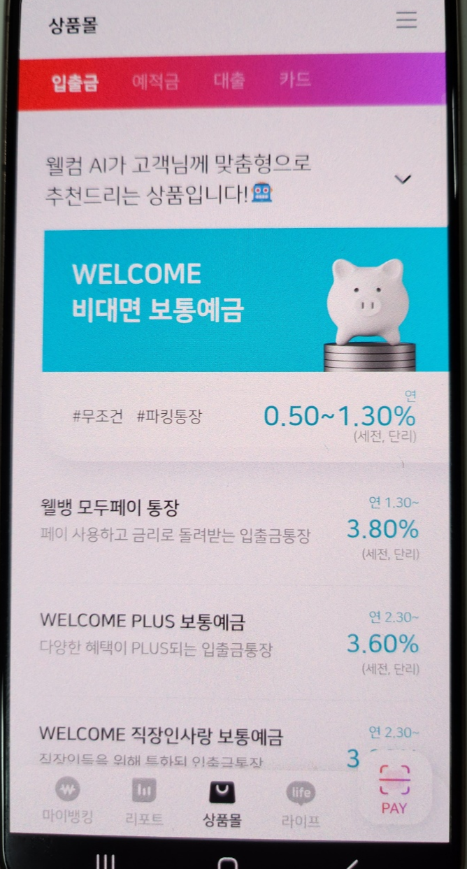 웰컴 저축은행 하단에 상품몰 - 입출금 통장에서 아무 통장이나 개설을 눌러보면
