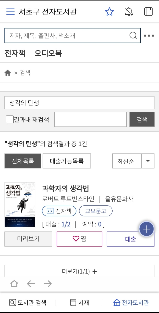 교보전자도서관앱에서 도서관 검색을 하여 서초구 전자도서관을 들어가신 다음