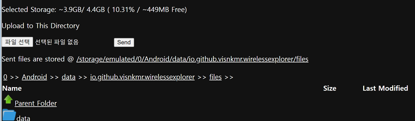 컴퓨터로 위에 나오는 IP주소로 접속하면 파일을 전송하고 다운로드 받을 수 있습니다.