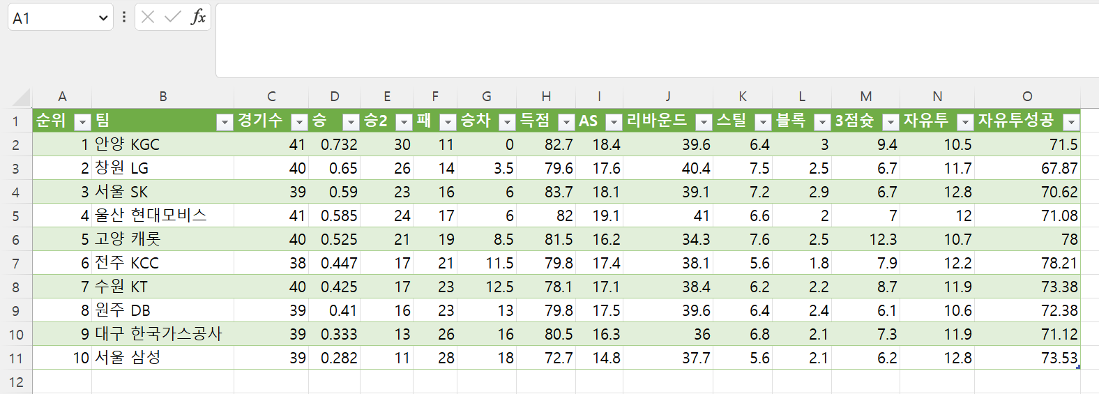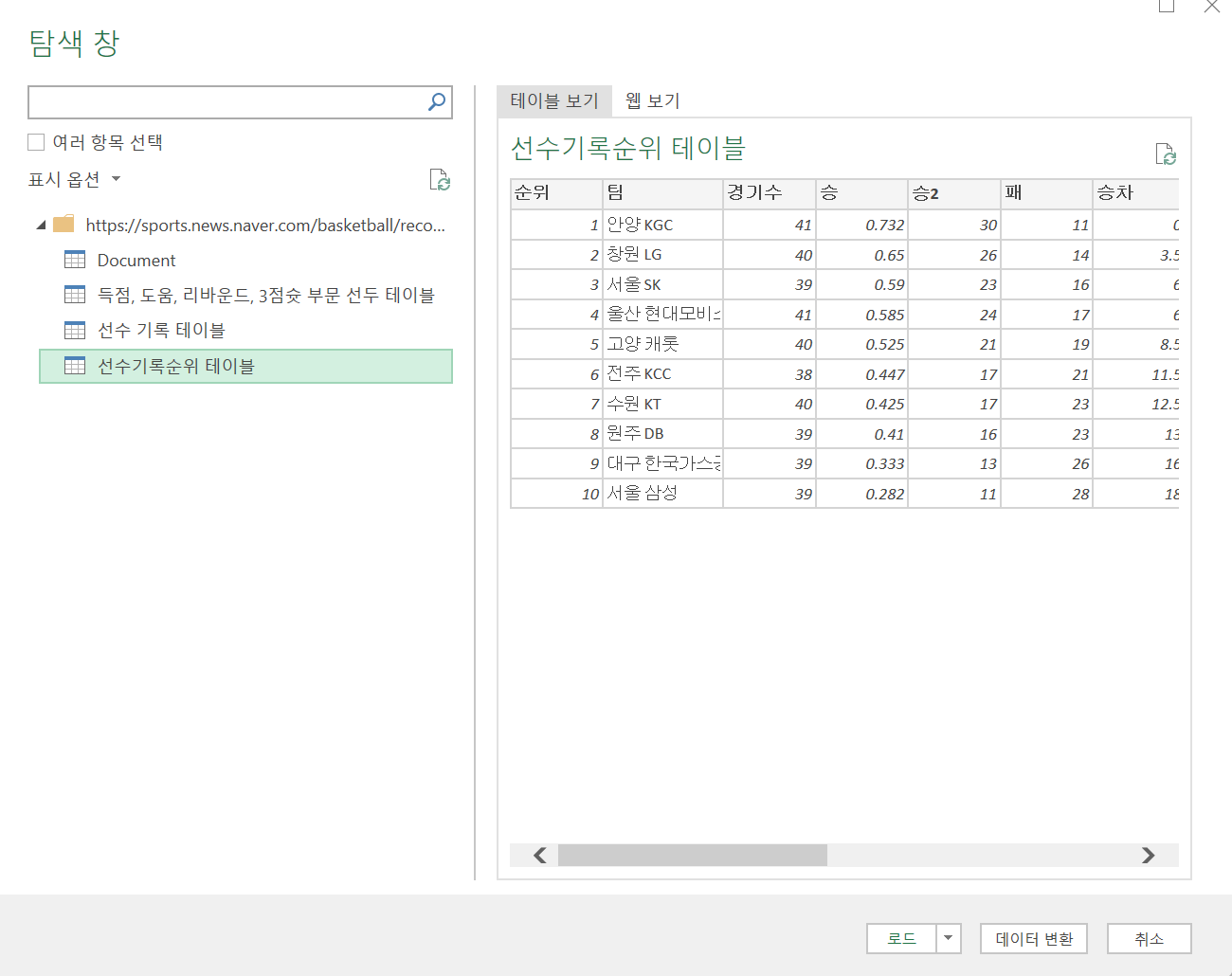 예를 들어 네이버 스포츠에서 농구 순위를 복사하려고 한다고 하면, 아래 주소에서 볼 수 있는데요.