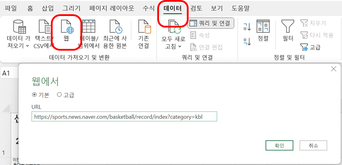 엑셀에서 데이터 - 웹에 URL에 방금 복사하고자 하는 페이지를 붙여넣습니다.