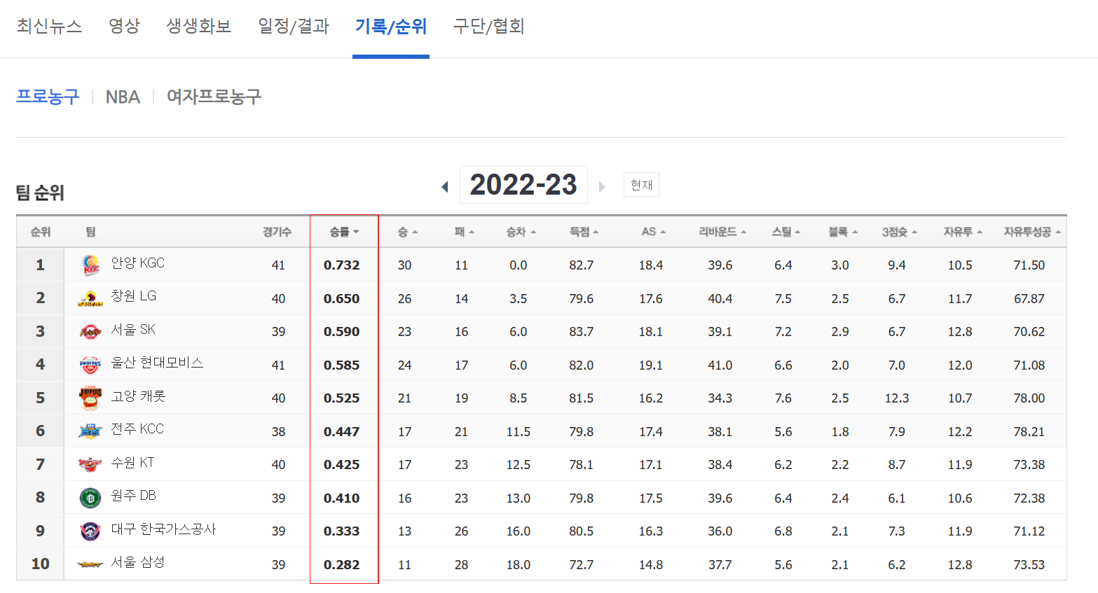 기록/순위, 농구 : 네이버 스포츠 (naver.com)