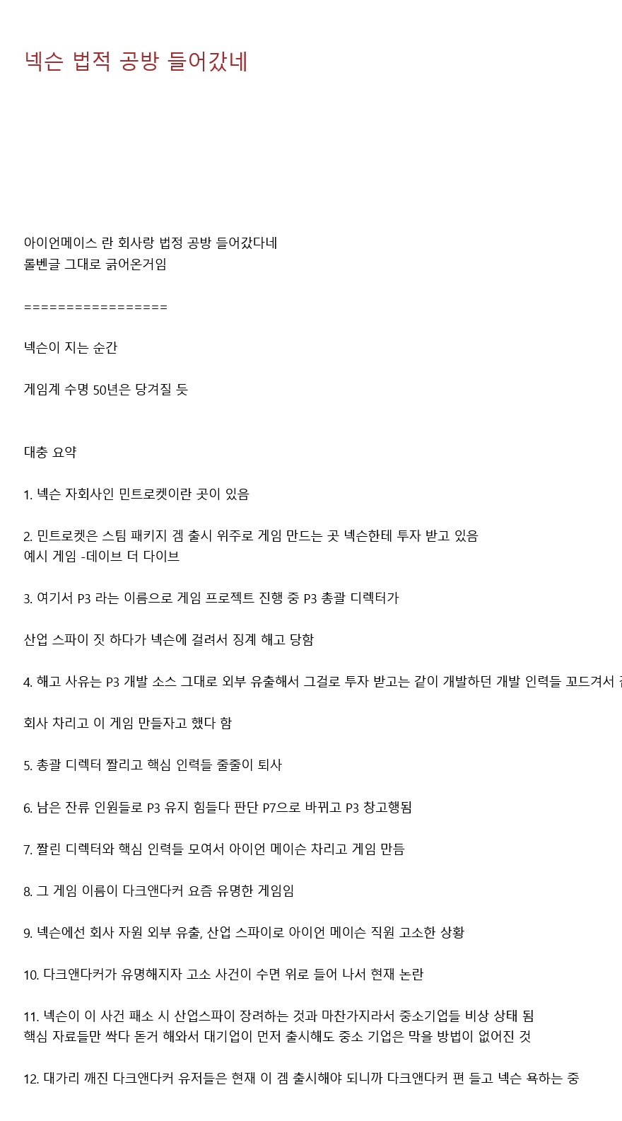 다크앤다커 사태는 넥슨에서 개발하던 프로젝트를 사내 개발자가 무단으로 반출하려다 징계해고를 당한 뒤