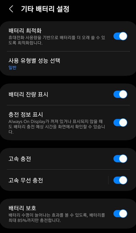 기타 배터리 설정에 가시면 배터리 보호 기능을 활성화 할 수 있습니다.