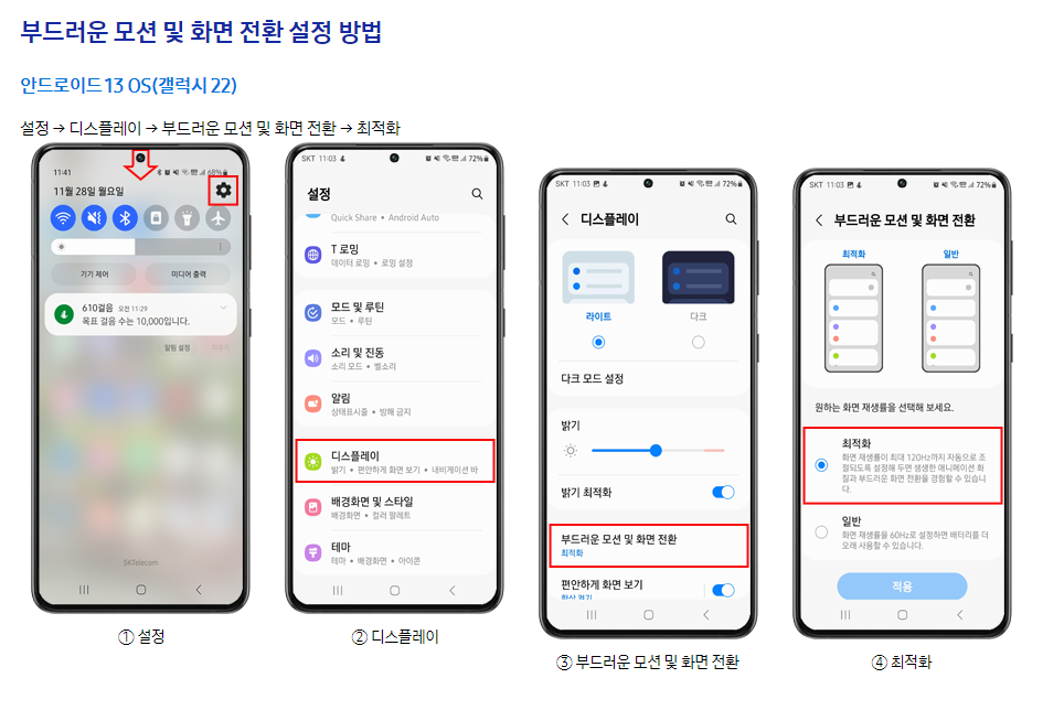 부드러운 모션 및 화면 전환을 최적화로 설정하면 120Hz로 화면 주사율이 되는데요.