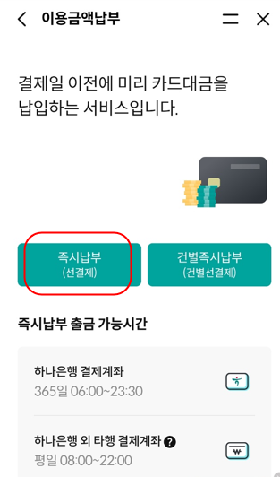 하나카드 홈페이지의 마이페이지 -> 이용금액결제 -> 즉시결제 메뉴에서 연체금액을 납부할 수 있습니다.
