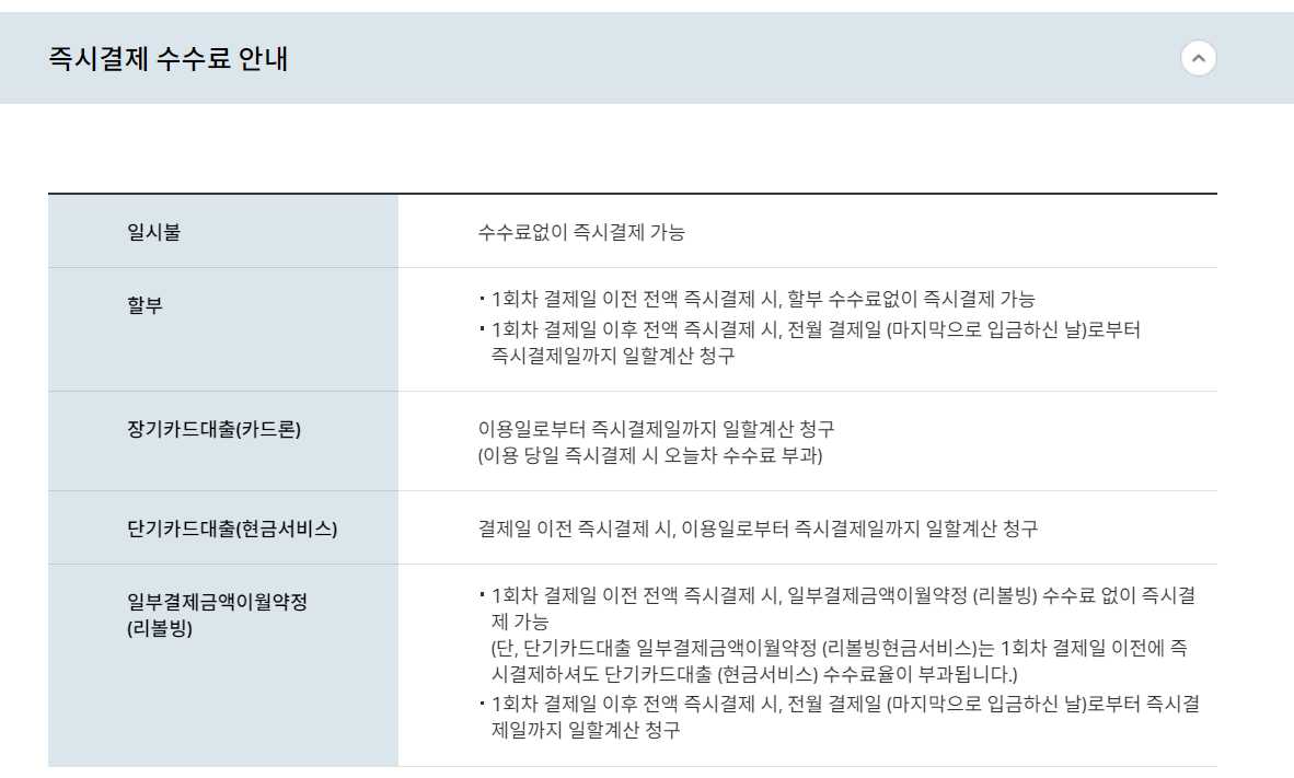 일시불의 경우에는 수수료가 없고, 할부의 경우 1회차 결제일 이후 부터 일할계산되며,