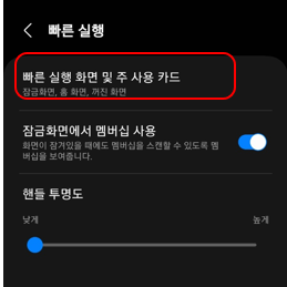 삼성페이에서 빠른실행시 가장 먼저 뜨는 카드를 설정할 수 있습니다.