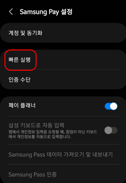 이곳에서 삼성페이의 빠른 실행에 관한 설정을 모두 관리할 수 있습니다.