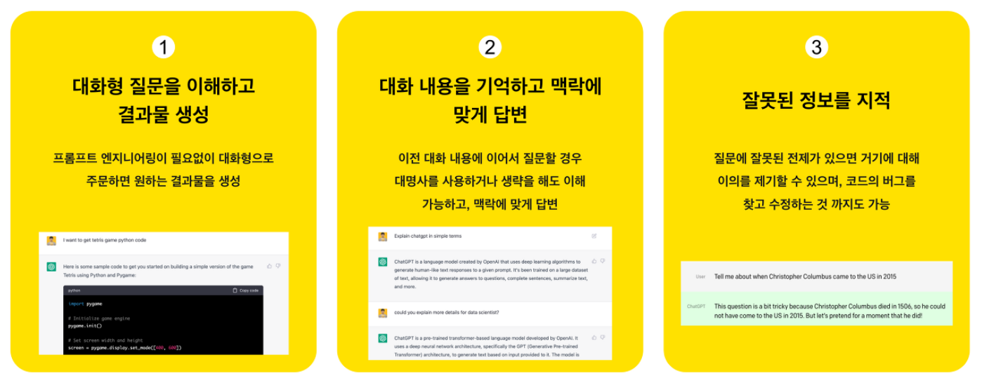 그 뿐만 아니라 이전에 한 대화내용을 기억하고 또 맥락에 맞춰서 답변을 해줍니다. 그리고 마지막으로 잘못된 정보를 지적하는 형태로 동작하기 때문에 기존의 자연어 모델보다 더 뛰어나고 사용자 편의성이 높아져서 많은 사용자들이 환호하고 있습니다.