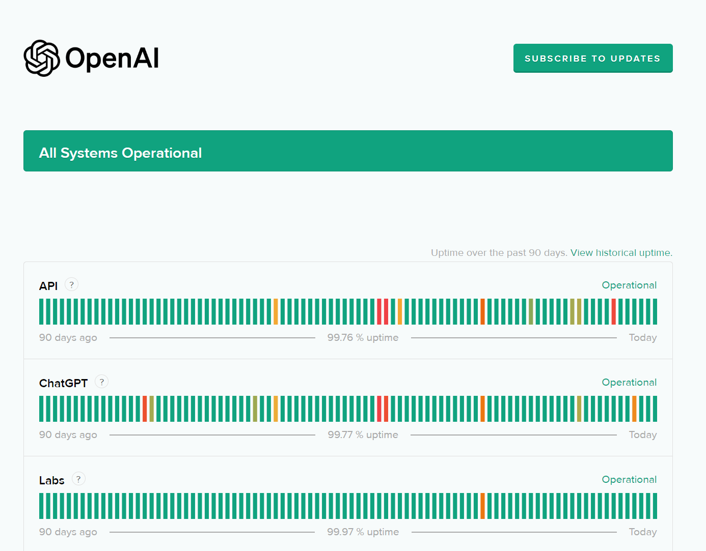 All Systems Operational API ? Operational 90 days ago 99.76 % uptime Today ChatGPT ? Operational 90 days ago 99.77 % uptime Today Labs ? Operational 90 days ago 99.97 % uptime Today Playground ? Operational 90 days ago 99.96 % uptime Today Operational Degr