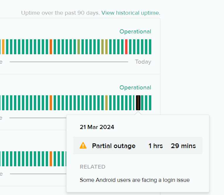 해당위치에 마우스를 가져다 대면 문제의 원인을 알 수 있습니다. ChatGPT의 경우 3월 21일에 한시간 반정도 안드로이드 사용자의 로그인이 에러가 발생했다고 합니다.