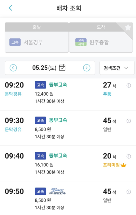 출발지와 목적지의 터미널을 검색하면 버스를 예매할 수 있는데요.