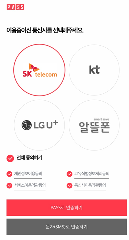 본인인증으로 넘어가서 Pass로 인증하시거나 Pass앱 미설치시 문자로 인증하기를 눌러서 본인인증을 마쳐줍니다.
