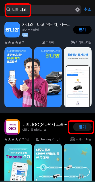 앱스토어에서 티머니고를 검색하고 하단에 있는 주황색 티머니Go(온다택시 고속)이라는 앱을 설치해 줍니다.