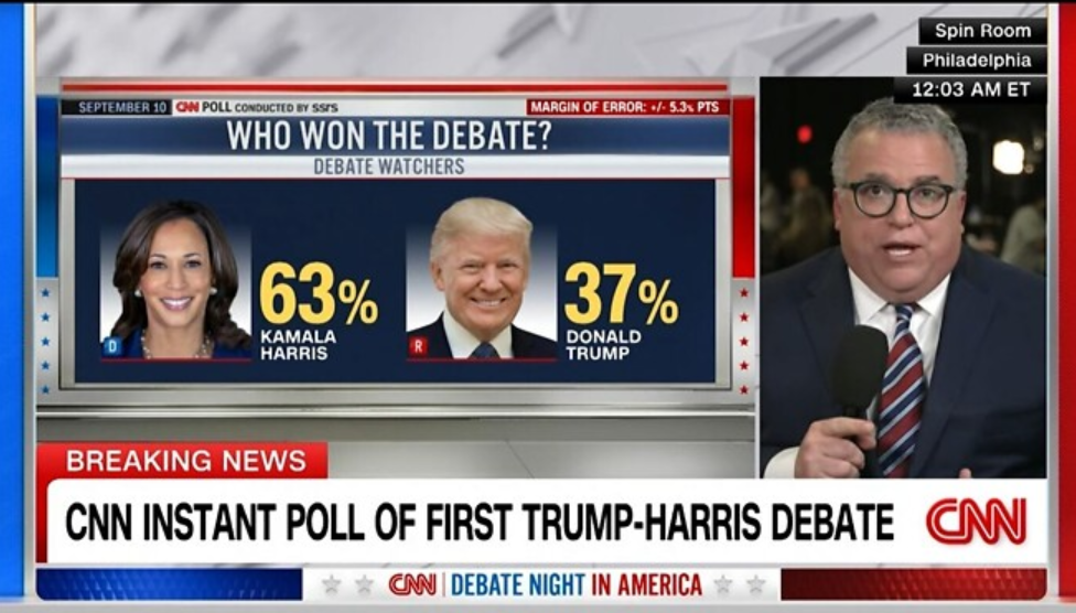 실제로 미국 언론에서 토론회의 승자는 해리스라고 하는 것이 63%에 달했습니다. 시종일관 헛소리를 하던 트럼프의 지지자가 37%나 된다는 것도 놀랍습니다.