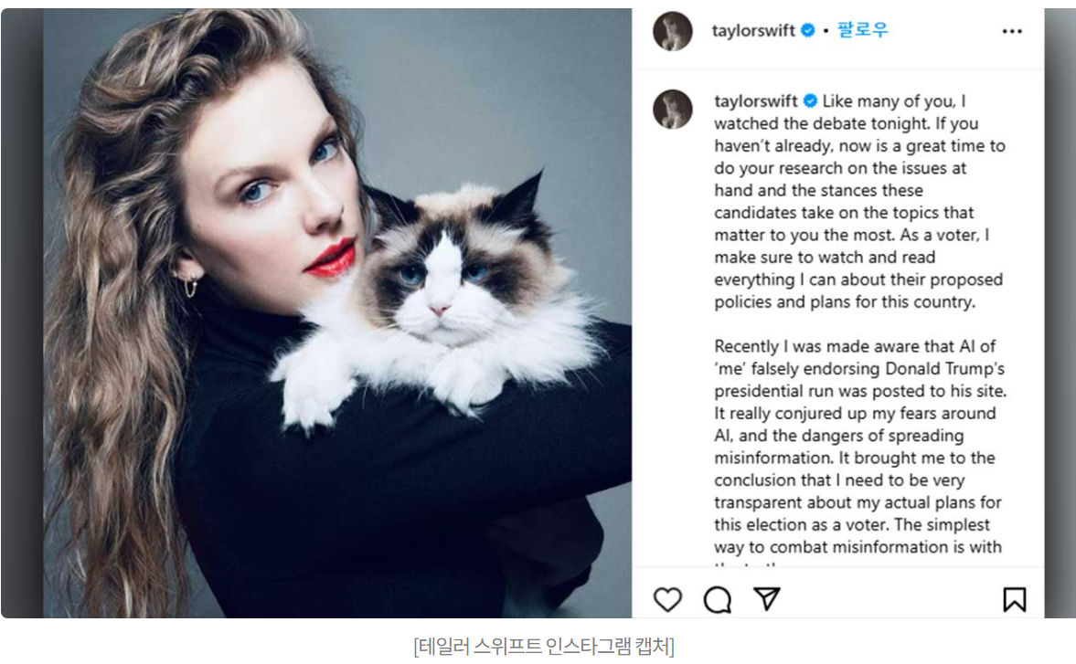 특히 스위프트는 자신이 트럼프를 지지한다는 가짜 뉴스가 유포된 것과 관련해 "AI에 대한 두려움과 잘못된 정보 확산에 대해 고려하게 됐다"며, "유권자로서 투명해야 한다는 결론에 도달했다"고 공개 지지 표명에 나서게 된 배경을 설명했습니다.