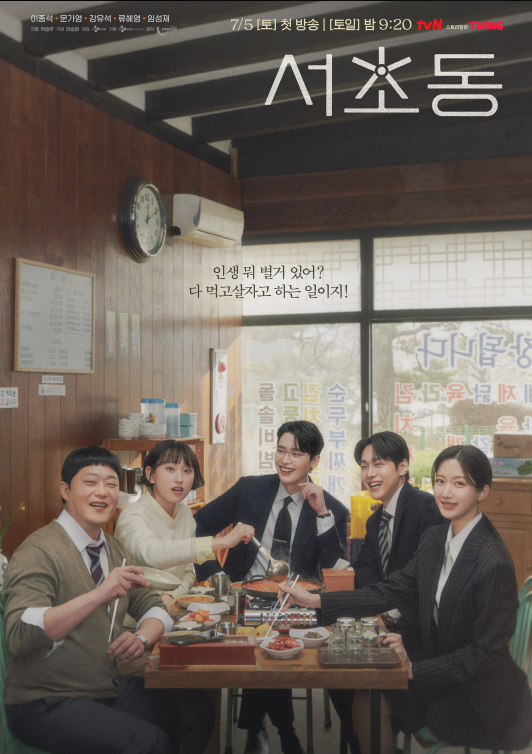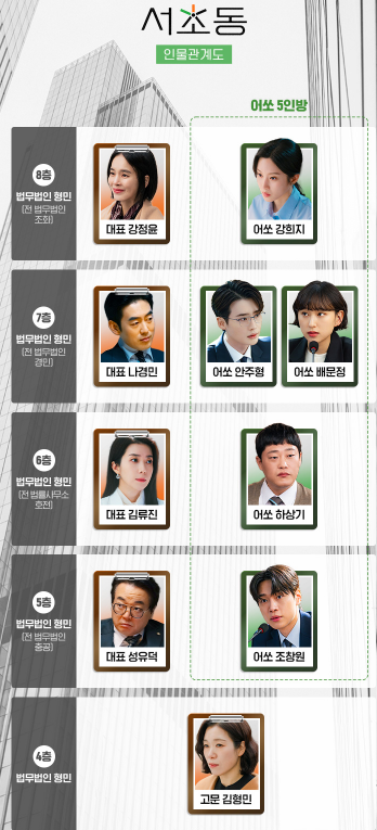 출연진은 주인공 안주형(이종석), 강희지(문가영), 그리고 어쏘 5인방에는 조창원(강유석), 배문정(류혜영), 하상기(임성재)가 출연합니다. 서초동에 있는 빌딩주인 김형민은 법무법인을 세우는게 꿈이었고, 본인 건물에 세들어 살던 법무법인을 통합하여 법무법인 형민을 세웁니다. 그리고 그 법무법인에 있는 어쏘 변호사 5명이 서로 밥친구로 지내는데요. 그래서 저 포스터가 이 드라마를 관통하는 모습이지 않을까 싶습니다.