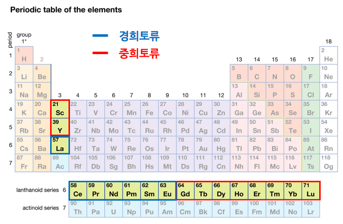 주기율표 제 3A족인 스칸듐(Scandium, Sc, 원자번호 21), 이트륨(Yttrium, Y, 번호 39)과 원자번호 57(란탄늄)에서 71(루테튬)까지 란탄계열 원소 15개를 더한 17원소를 말합니다.