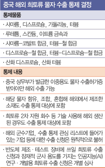 10월: 중국 상무부가 수출통제 품목을 12종으로 확대하고, 희토류 기술의 해외 이전까지 금지. 중국산 희토류 0.1%라도 포함된 제품까지 통제대상으로 포함시키는 ‘역외 통제’ 전략을 발표했습니다.