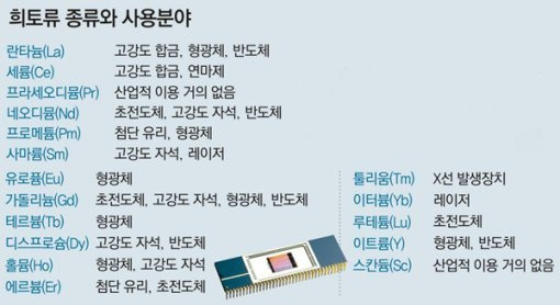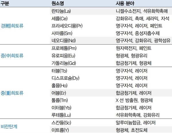 희토류는 화학적으로 매우 안정적이고 건조한 공기 속에서도 오랫동안 잘 견뎌내며 열을 잘 전도하는 양도체입니다. 이런 화학적 성질 때문에 최근 광학유리, 전자제품, 금속첨가제, 촉매제 등 첨단 산업의 중요한 원자재로 이용되고 있습니다.