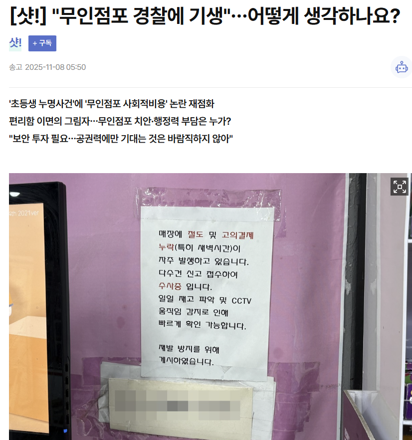 최근 무인 매장이 늘어나면서 절도 사건도 빈번해지고 있는데요. 이와 관련해 너무나 안타까운 비극이 발생했습니다.