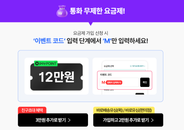 이외에도 다양한 이벤트가 있는데요. 12월에는 이벤트코드에 'M'만 입력하면 12만원을 제공하고 있어요. 그 외에도 바로유심 개통시 2만원, 친구초대 혜택 3만원으로 최대 17만원 혜택도 받을 수 있습니다. 다양한 할인 혜택을 받을 수 있는 kt M모바일의 이벤트를 확인해 보시기 바랍니다.