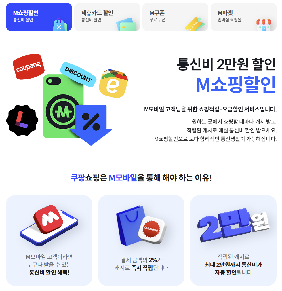 M쇼핑할인은 kt M모바일의 특별한 서비스인데요. kt M모바일을 경유해서 쇼핑하면 통신비를 할인받을 수 있는 서비스로 M모바일 고객이라면 누구나 이용 가능한 서비스입니다.
