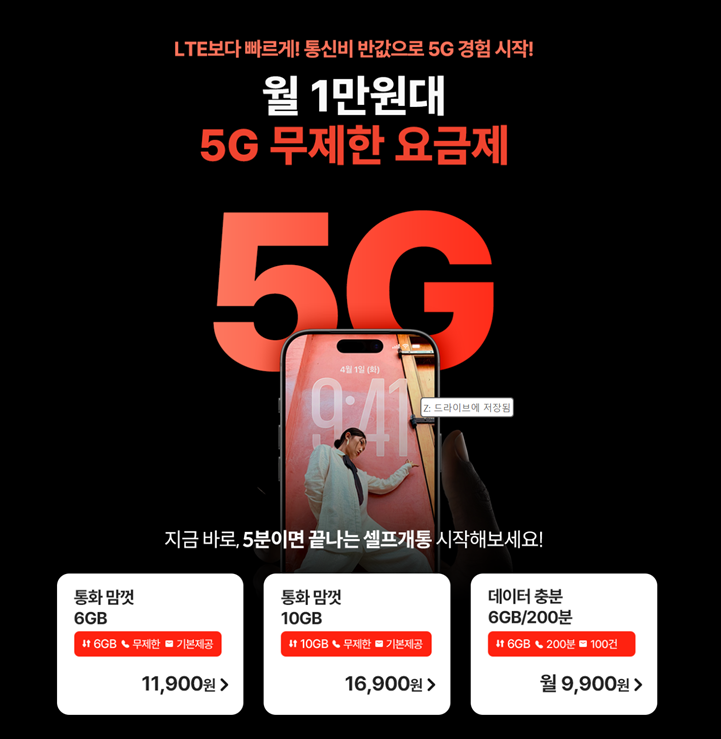 5G 데이터 충분 6GB (데이터 6GB / 음성 200분 / 문자 100건)