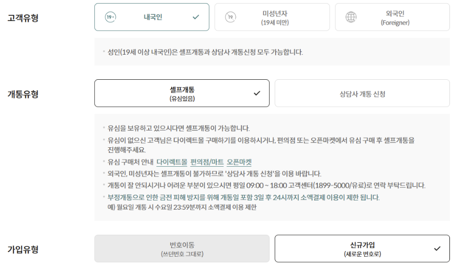 셀프 개통은 신규 가입의 경우 8시부터 21시 50분까지, 번호이동은 10시부터 19시 50분까지이니 시간을 한번 확인하시기 바랍니다.