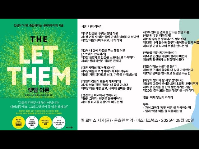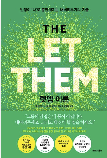 | “그들의 감정은 내 몫이 아닙니다. 내버려두세요. 그리고 당신이 할 일을 하세요!”전세계가 열광한‘LET THEM’의 마법, 드디어 한국 상륙! 무의미한 노력과 헛발질을 당장 멈추게 할 2025년 최고의 화제작! “그들의 감정은 내 몫이 아닙니다. 내버려두세요. 그리고 당신이 할 일을 하세요!” 지금 직장에서, 인간관계에서, 그리고 일상에서 답답함이나 버거움, 또는 좌절감을 느끼고 있다면, 문제는 당신이 아니다. 그건 당신이 인생을 주체적으로 이끌 힘을 타인에게 넘겨주었기 때문이다. 즉 남의 기대, 남의 말, 남의 감정, 남의 행동 같은 통제할 수 없는 일에 에너지와 시간을 낭비하느라, 내가 마땅히 누려야 할 행복의 길로 가지 못하고 있는 것이다. 바로 이럴 때 ‘렛뎀’(Let Them), 즉 내버려두기의 기술을 기억한다면 내 인생의 주도권을 다시 가져올 수 있다. 저자 멜 로빈스는 이 책에서 중요하지도 않은 것들을 신경 쓰느라 나를 소모하는 싸움에서 벗어나, 진정 중요한 것-즉 자기 자신, 자기 행복, 목표, 인생-에 집중하는 방법을 알려준다. 통제할 수 없는 일에 에너지를 낭비하지 않는 법, 끊임없는 비교를 멈추고 두려움과 자기 의심을 극복하는 법, 타인의 기대나 평가에서 자유로워지는 법, 건강한 인간관계와 깊은 유대를 만드는 법, 중요한 목표를 자신 있게 추구하는 법, 스트레스에 대한 회복력을 기르는 법, 나만의 성공과 성취의 길을 찾는 법... 이 책은 저자가 SNS에 올린 짧은 영상이 수천만 뷰를 기록하고, ‘Let Them’ 타투 인증샷이 유행처럼 번지면서 그 화제성을 업고 출간하게 되었다. 수백만 독자의 공감과 열렬한 지지를 얻으며 출간 즉시 아마존 베스트셀러 종합 1위에 오른 《렛뎀 이론》은, 오롯이 ‘나’로 충만한 인생을 살고 싶어진 모든 이에게 행복의 잠재력을 열어줄 가장 쉽고 심플한 도구를 선물할 것이다. “정확히 내가 하고 싶은 말이다. 지금껏 읽은 자기계발서 중 단연 최고다!” - 오프라 윈프리 (방송인) |