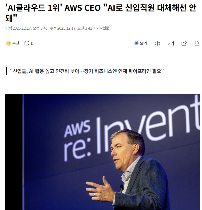 최근 생성형 AI가 비약적으로 발전하면서, "이제 신입 개발자는 필요 없는 것 아니냐"는 목소리가 많은데요. 하지만 클라우드 시장 세계 1위 기업인 아마존웹서비스(AWS)의 매트 가먼(Matt Garman) CEO는 이에 대해 "매우 근시안적인 생각"이라며 강력한 경고 메시지를 던졌습니다.