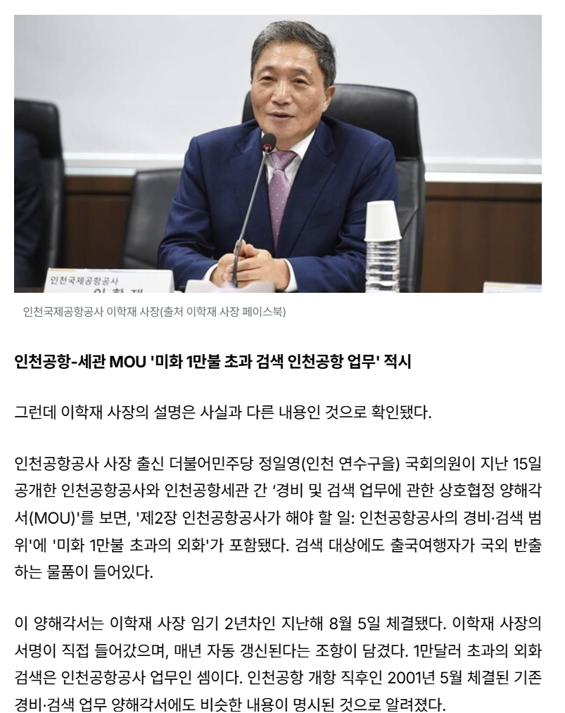 그래서 요즘 핫한 인천국제공항공사 이학재 사장의 경우 미화 1만불 초과 검색은 심지어 본인이 합의한 MOU에 있는데도 그 업무를 전혀 파악하지 못하고 있는 CEO가 된 것입니다. 업에 대한 이해가 없으면 이렇게 산으로 가게 됩니다. 거짓말이어도 문제고 사장이 이런 문제를 몰랐다면 더 큰 문제입니다.