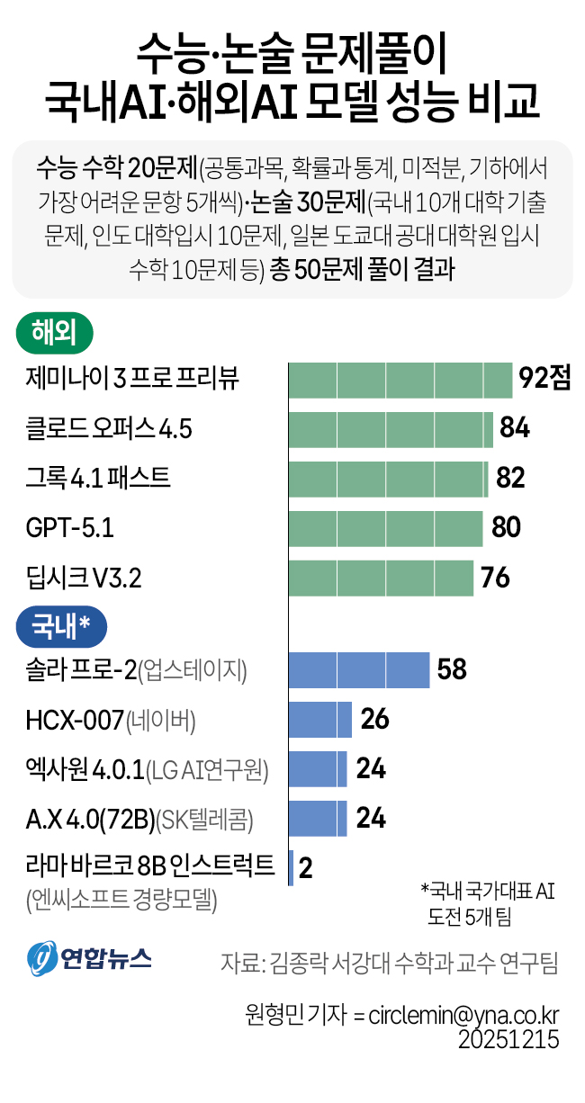 연구팀은 수능 문제로는 공통과목, 확률과 통계, 미적분, 기하에서 가장 어려운 문항 5개씩을 뽑아 20문제를 설정했고, 논술 문제는 국내 10개 대학 기출 문제와 인도 대학입시 10문제, 일본 도쿄대 공대 대학원 입시 수학 10문제 등 30문제를 설정해 총 50개 문제를 10개 모델에 풀게 했습니다.