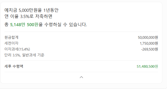 비과세 한도 최대인 5천만원을 3.5%이율로 예금할 경우 비과세 혜택은 26만9500원이 됩니다.