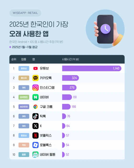 25년 한국인이 가장 오래 사용한 앱