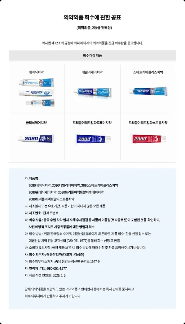 현재 약사법 제 72조에 따라서 2080 8개 치약에 대해서 긴급 회수를 진행한다고 합니다.
