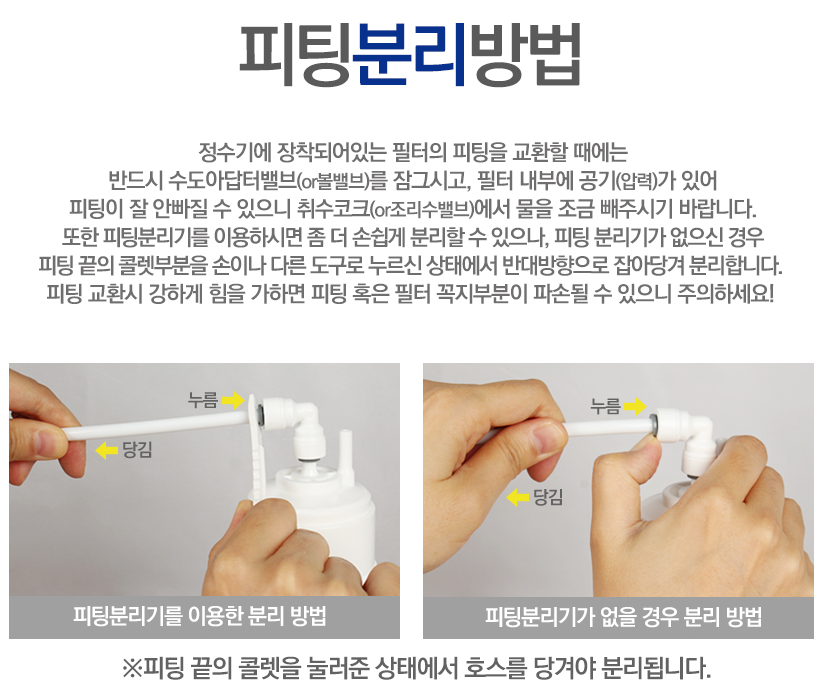 피팅을 빼려면 원래 피팅 분리기가 있으면 쉽게 빼는데 집에 없는 경우 손가락으로 누르면서 당겨야 하는데요. 이게 생각보다 좁은 싱크대에서 하기가 쉽지 않습니다 ㅎㅎ