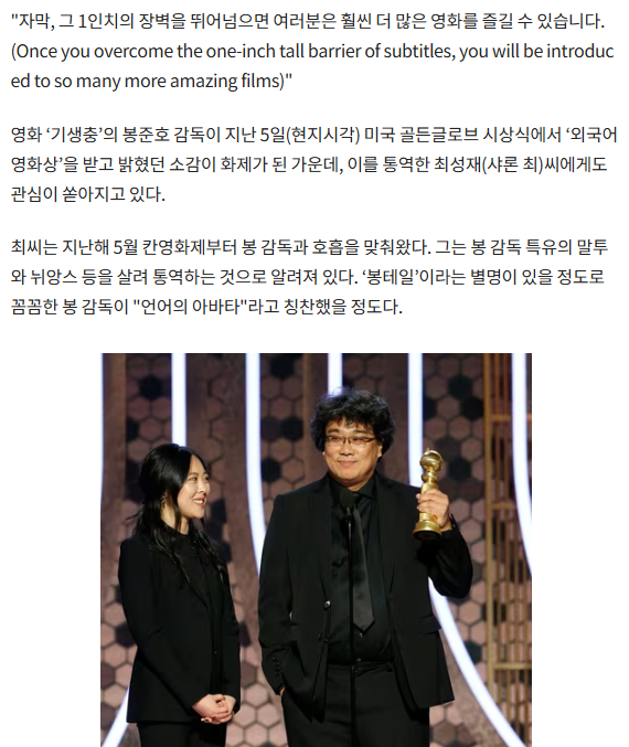 이 통역이라는 점은 기생충의 봉준호 감독이 골든글로브 시상식에서 수상소감을 할때 1인치의 장벽이라고 표현했는데요. 통역사가 어떻게 통역하느냐에 따라 전혀 다른 느낌으로 다가올 수 있습니다.
