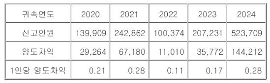 해외주식 양도소득세 신고자는 2020년 13만9천909명에서 2021년 24만2천862명으로 늘었고, 2022년 증시 침체에 10만374명으로 쪼그라든 뒤 2023년(20만7천231명) 다시 20만명대 진입했다고 합니다. 2024년 이들이 신고한 총 양도차익은 14조4천212억원으로 집계됐다. 전년(3조5천772억원)보다 303.1% 늘어난 수준입니다. 양도차익을 신고자로 나눈 1인당 양도차익은 2천800만원에 해당합니다.