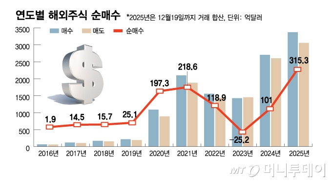 거기다가 한국예탁결제원에 따르면 2022년 442억 달러 수준이던 미국 주식 보관액은 2023년 680억 달러로 늘었고, 2024년 1천121억 달러로 폭발적으로 증가했습니다. 작년 말에는 이보다 늘어난 1천636억 달러라고 하는데요.