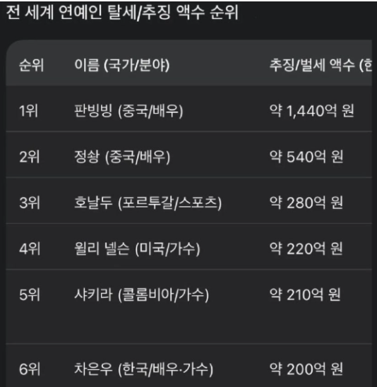 차은우의 추징액은 국내 연예인 중 최대 규모이며, 세계적으로도 손에 꼽혔다. 중국배우 판빙빙(약 1440억원), 정솽(약 540억원), 포르투갈 축구선수 크리스티아누 호날두(약 280억원), 미국 가수 윌리 넬슨(약 220억원), 콜롬비아 가수 샤키라(약 210억원)에 이어 6위를 차지한다고 합니다.